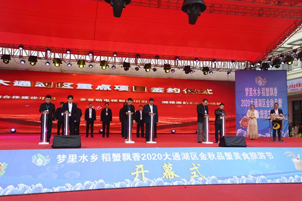 在10月18日舉行的“夢里水鄉(xiāng) 稻蟹飄香”2020大通湖區(qū)金秋品蟹美食旅游節(jié)開幕式上,董事長郭躍明(右二)代表公司與大通湖區(qū)委區(qū)政府現(xiàn)場簽約,開啟了大通湖區(qū)“湘情湘韻”智慧田園綜合體項(xiàng)目開發(fā)的序幕。