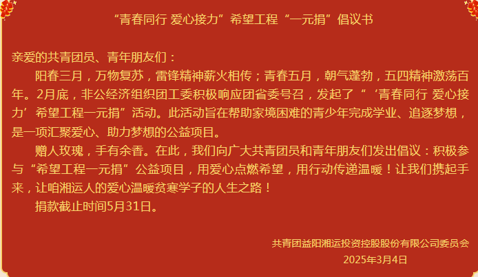 截止3月17日,共青團(tuán)益陽湘運(yùn)投資控股股份有限公司委員會組織發(fā)起的“希望工程一元捐”活動,響應(yīng)及參與募捐達(dá)191人次。