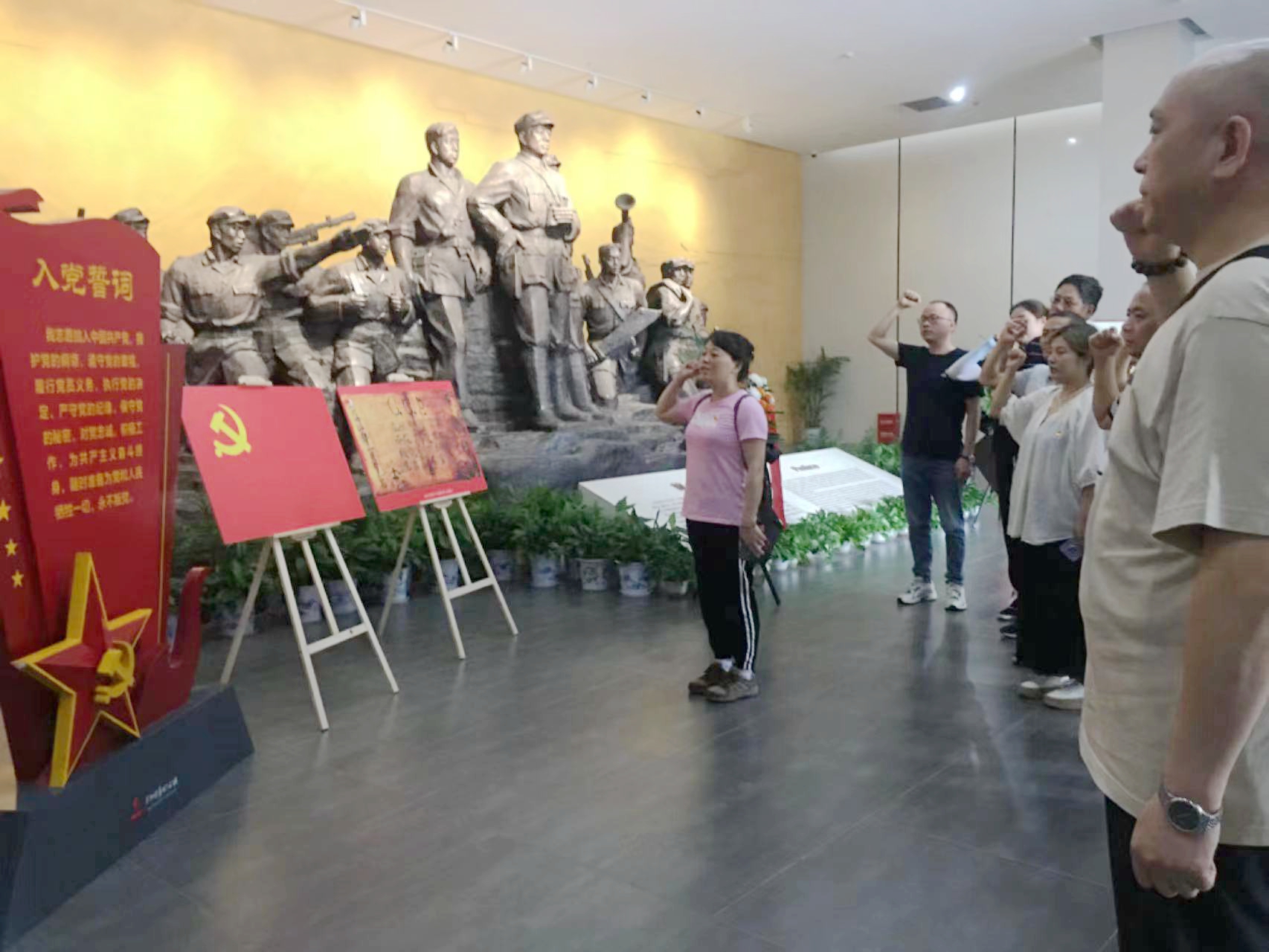 在平江起義紀念館,37名同志跟隨講解員,邊聽邊看。通過精彩的講解和史料陳列館內(nèi)的實物、照片,在凝重肅穆的氣氛中,大家重溫了湖南農(nóng)民運動那段熱血沸騰的歷史,追憶了在中國共產(chǎn)黨領(lǐng)導(dǎo)下開辟湘鄂贛革命根據(jù)地的艱難歷程,深刻體會到了共產(chǎn)黨人不怕犧牲、不屈不撓的革命斗爭精神。在館內(nèi),大家還一起重溫了入黨誓詞。
