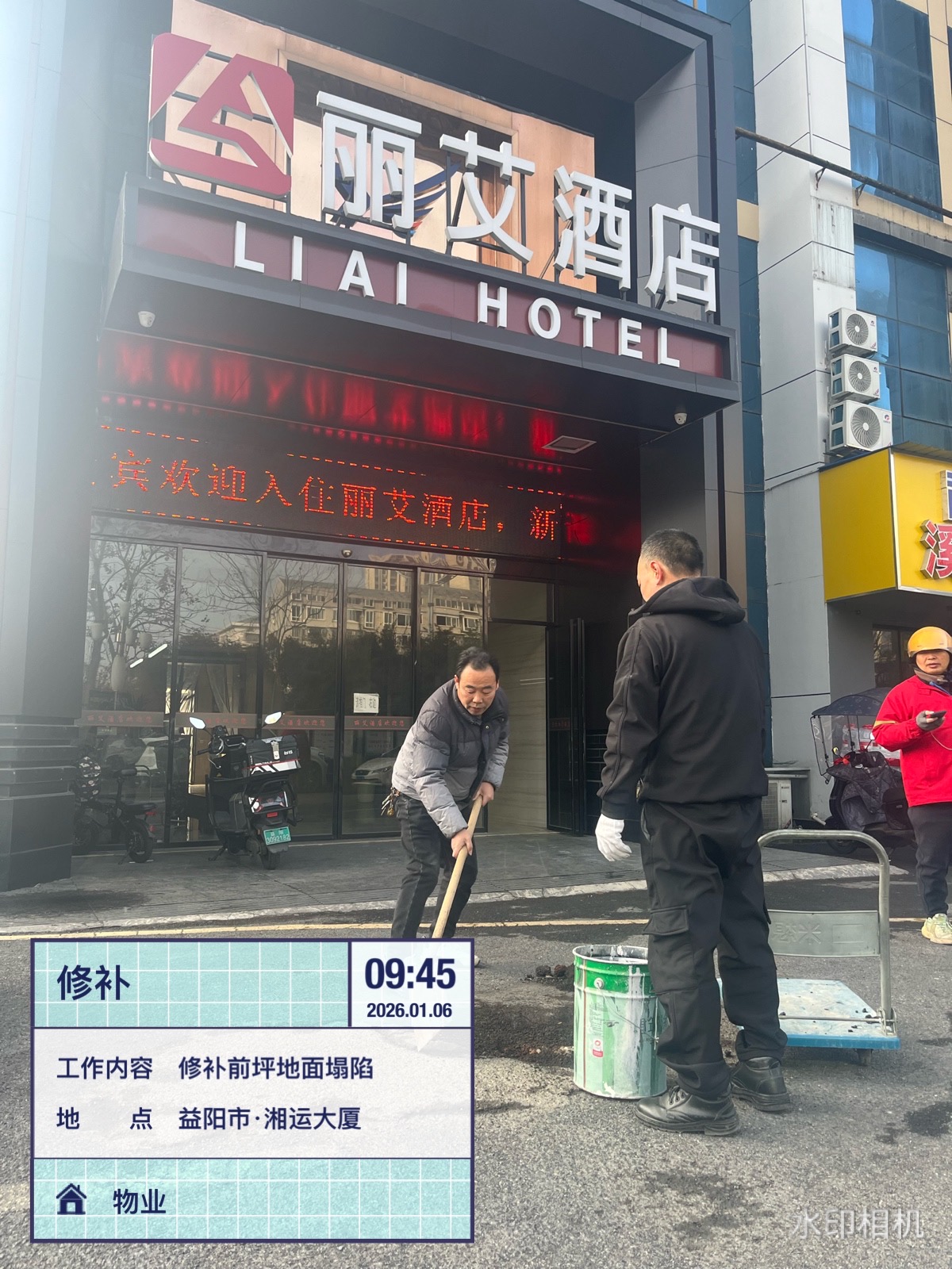 1月6日9︰45,湘運(yùn)大廈前坪有2名工作人員正在修補(bǔ)地面塌陷。這是湖南遠(yuǎn)程建設(shè)集團(tuán)有限公司物業(yè)部對(duì)大廈公共區(qū)域環(huán)境實(shí)施專項(xiàng)維護(hù)工程的內(nèi)容之一。