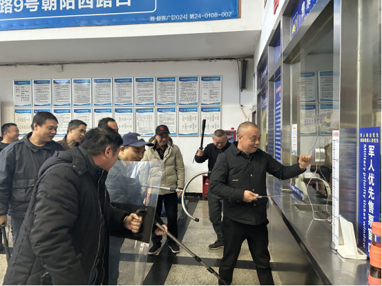 演練模擬“三品”檢查員在候車(chē)室入口發(fā)現(xiàn)有攜帶管制刀具的人員,要求其開(kāi)包檢查時(shí),“暴恐分子”拒絕接受檢查并持尖刀跑向售票處。現(xiàn)場(chǎng)工作人員立即啟動(dòng)應(yīng)急處置預(yù)案,緊急疏散正在窗口購(gòu)票的旅客,并第一時(shí)間撥打“110”報(bào)警,報(bào)告給應(yīng)急領(lǐng)導(dǎo)防暴小組組長(zhǎng)。隨后應(yīng)急小組成員第一時(shí)間趕到暴恐分子聚集點(diǎn),緊急疏散候車(chē)室人群,組織反恐防暴小組成員利用反恐器材與“暴恐分子”對(duì)峙。經(jīng)過(guò)小組成員的冷靜處置,迅速制服了暴恐分子。